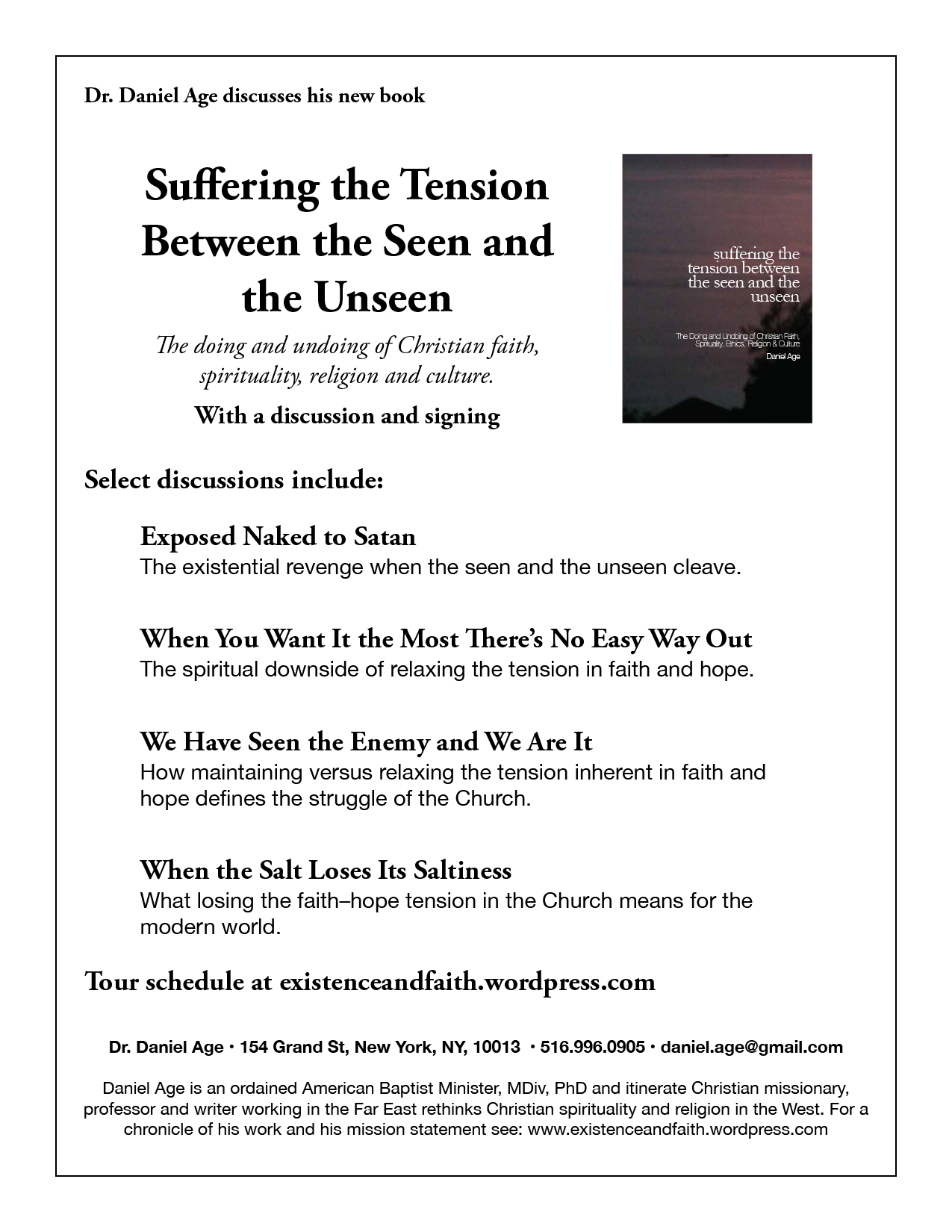 First Daniel shared the inspiration that led to writing the book: “I kept encountering students all over Asia in the colleges and seminaries where I taught who had a naive romantic notion of American religion and culture” he said. Asked to develop some ethics lectures in Burma he worked out some thoughts taken from the little phrase by Paul the Apostle: “We walk by faith and not by sight.” “The truth in this phrase” he said, “gradually opened up a new horizon providing fodder for a rethink about what is going on in many strands of Christian spirituality, religion and culture – especially in America.”